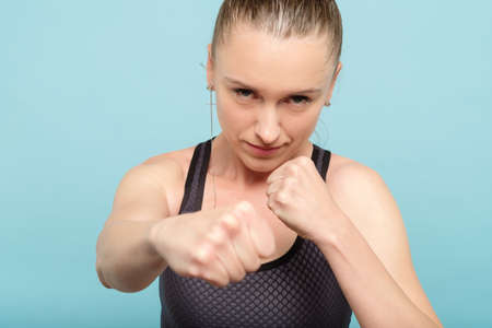 woman boxing straight blow. self defence strength training and female fighter concept.