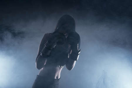 Female boxer with boxing gloves on a dark background in the smoke.