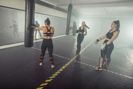 Two women kickboxers are training in the gym. Sport and healthy lifestyle.