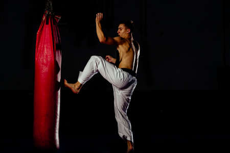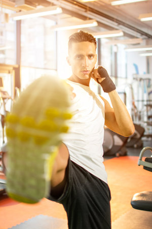 Male fighter in action. Leg kicking.