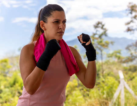 Strong Latina woman in boxing position with gloves and towel outdoors