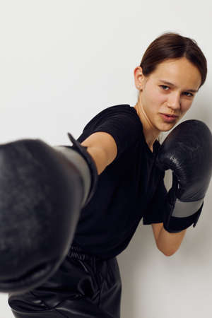 photo pretty girl in black sports uniform boxing gloves posing Lifestyle unaltered