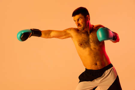 One professional male boxer in sportswear and gloves isolated on yellow studio background in neon light. Concept of sport, activity, movement, wellbeing.