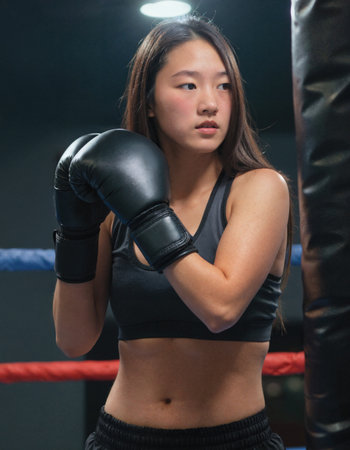Asian woman in a boxing gym, wearing a black sports bra and shorts, with black boxing gloves, standing confidently in front of a punching bag.