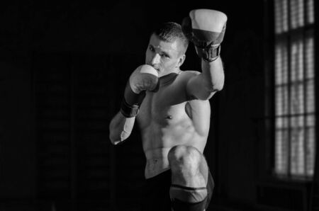 Muscular kick boxer or muay thai fighter punching. Kickboxing fighter in boxing gloves hitting shadow, training for competition. Boxing punch.