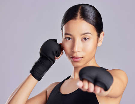 Female boxer hitting at a boxing studio. Woman boxer training hard.