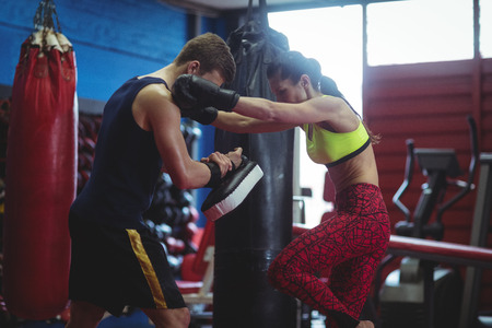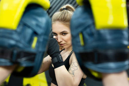 Beautiful girl in boxing gloves hits the paws held by her trainer