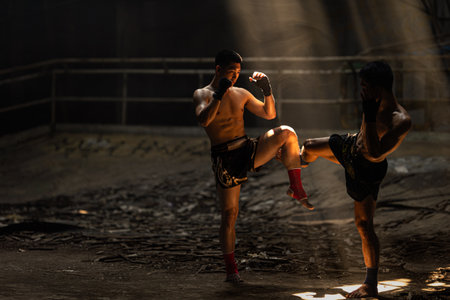 Muay Thai, Asian young male Bare Knuckle Fighting street kick boxing fighters fighting action, Thai fight boxing in dark old building