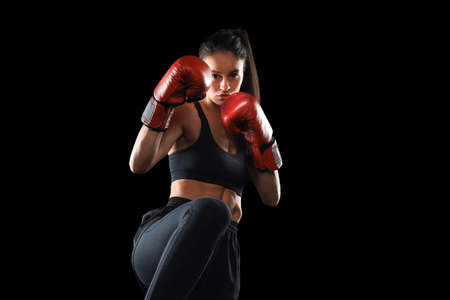 Kickboxing woman in activewear and red kickboxing gloves on black background performing a martial arts kick. Sport exercise, fitness workout