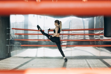 Young woman trains in kickboxing ring with heavy punching bag. Foot kicks or knee strike