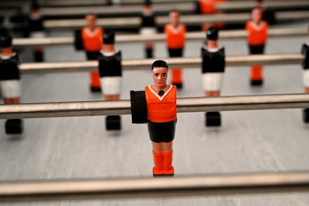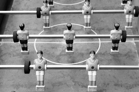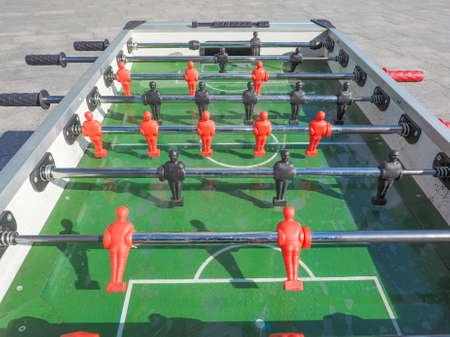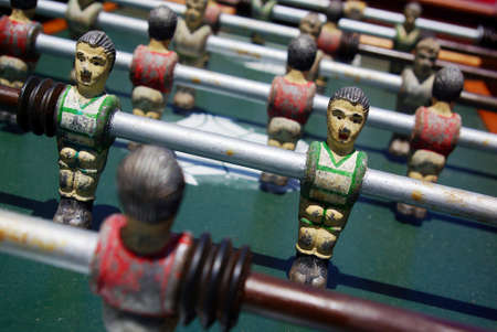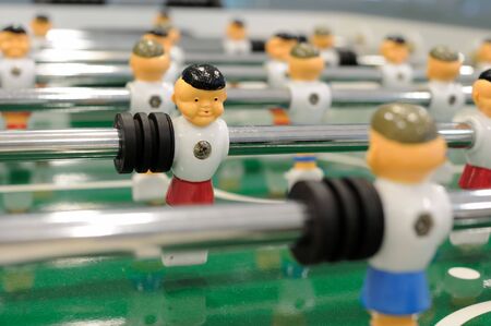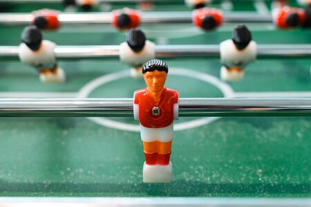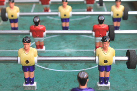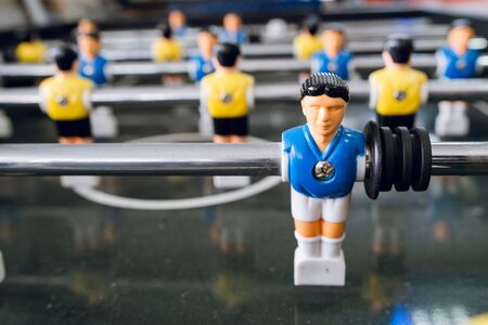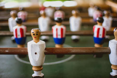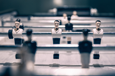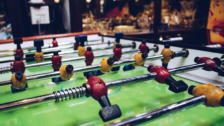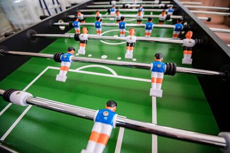 Entertaining games, fun play entertainment concept. Closeup of soccer table football players.