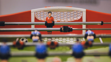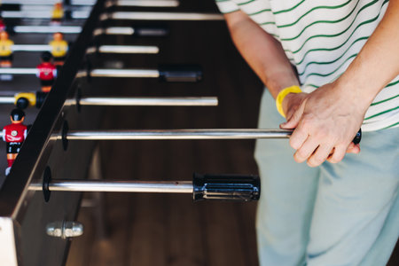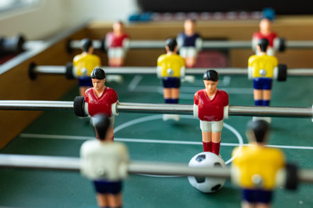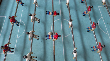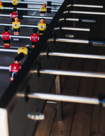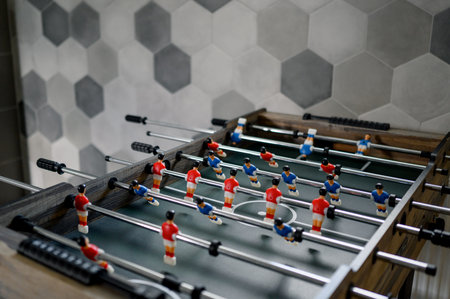 Close-up of players on a table football game (foosball), symbolizing competition, teamwork, and leisure activity.