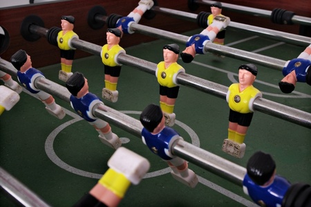 Table football aka table soccer, foosball from the German Tischfussball, baby-foot or kicker table-top game and sport