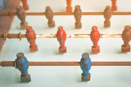 Closeup scene on player dolls in attack row rod ready before game start of vintage table football under lamp light in soft cool tone.