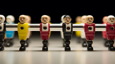 Close-up of colorful toy table football players lined up on metal rods, ready for play
