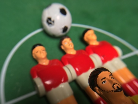 Close-up of table football game with red and white figures, shallow focus, ball ready for kick-off