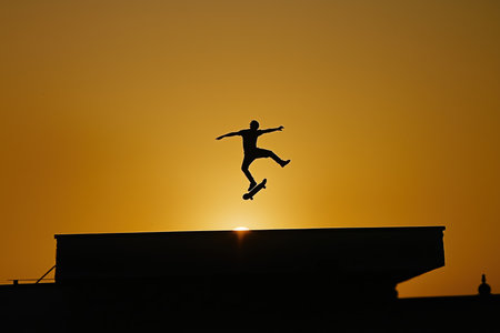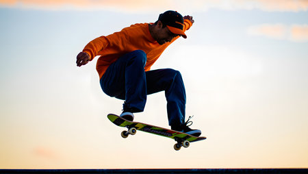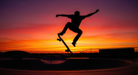 Silhouetted skateboarder launching into a jump at sunset, surrounded by a vibrant orange sky and wispy clouds, capturing the spirit of freedom