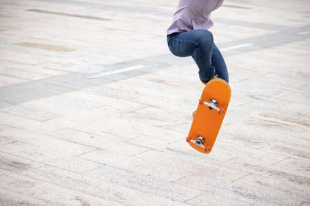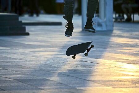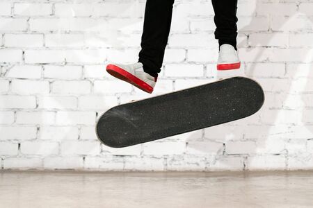 Skateboarder in action. Extreme sports lifestyle. Hipster performing ollie trick. Cropped shot. Copy space.