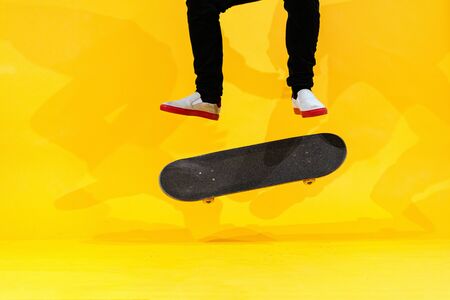 Skateboarder performing skateboard trick - kick flip on concrete. athlete practicing jump on yellow background in the studio, preparing for competition. Extreme sport, youth culture