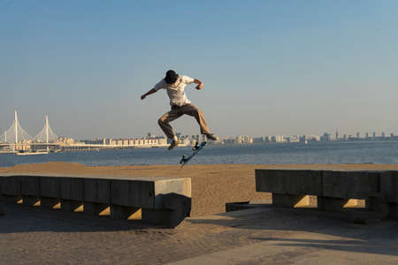 Skateboarder riding a skateboard in the city. Extreme sport.