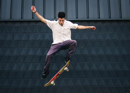 Favorite sport. Competent freestyler keeping arms in air while doing extreme tricks on skateboard
