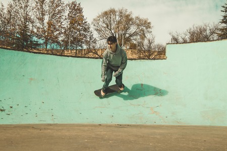 Skateboarder doing a trick in a skate park. Extreme sport.