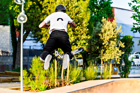 Young man practicing Scootering (Freestyle Scootering) in the new SkatePark in the central park of Igualada, Barcelona, Spain. blurred background
