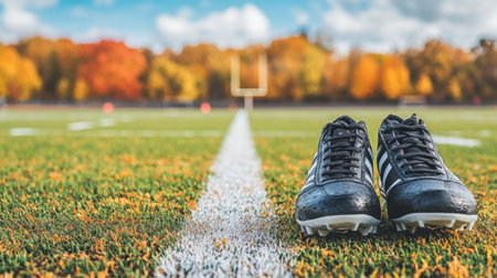 A pair of black soccer cleats sit on a lush green field with a goal post visible in the background. The scene captures a vibrant autumn landscape under a clear blue sky, symbolizing energy and teamwork in sports.
