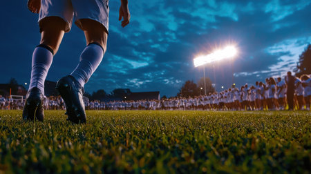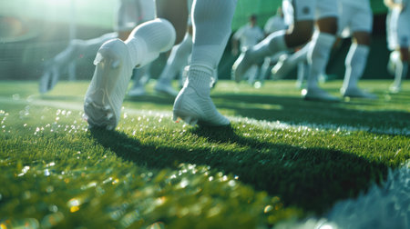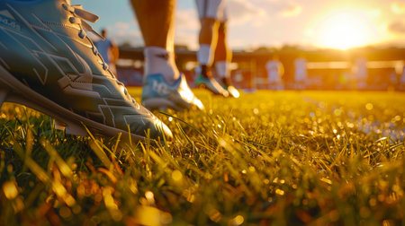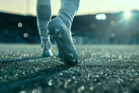 Soccer player walking on field, close-up of feet. Perfect for sports articles, soccer blogs, or athletic footwear advertisements