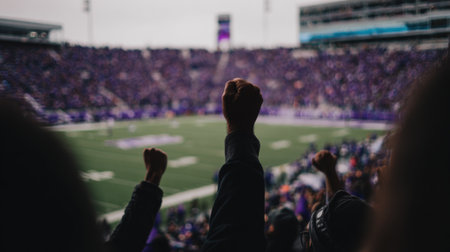 A crowd of enthusiastic fans raise their fists in the air, cheering during a football game in a packed stadium.