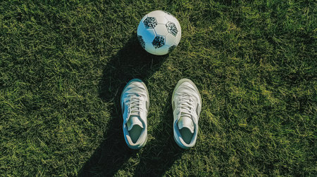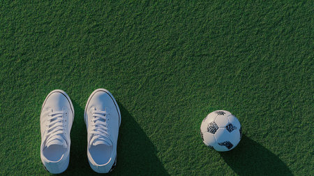 A pair of white sneakers sits on lush green turf beside a classic soccer ball, creating a vibrant scene ideal for sports and leisure activities, inspiring energy and movement.