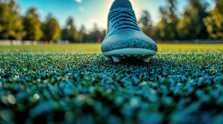 A close up of a soccer shoe positioned on bright green artificial grass under clear skies.
