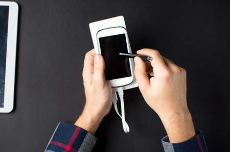 Man using a white cellphone connected to a power bank