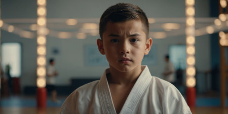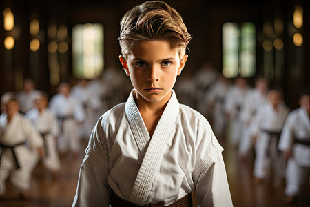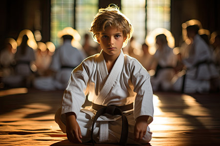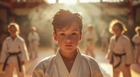 In a dojo, a young boy in a white karate uniform gazes at the camera with determination, surrounded by classmates in matching attire as sunlight streams in.