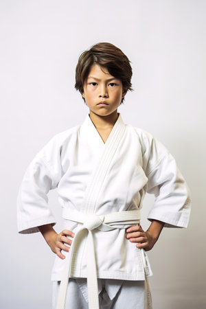 AI Generated. Cute and confident young Karate master posing for ads on a light colored display