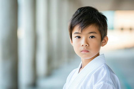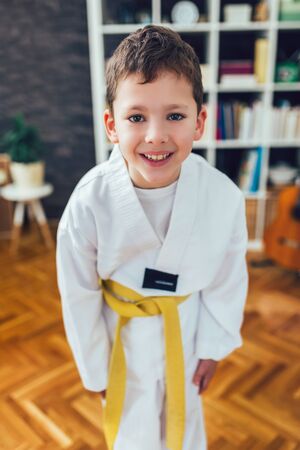 Happy european boy at judo or karate training lesson with copy space for text placement