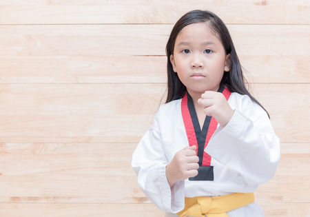 Asian taekwondo girl on acton on wood background, sport and healthy concept.