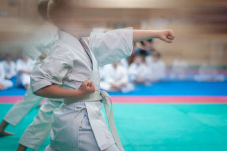 Kids training on karate-do. Direct punch training. Sports training and a healthy lifestyle. Photo without faces.