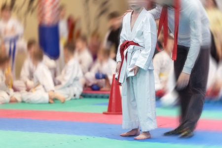 Sports background concept for martial arts with shallow depth of field and motion blur effect. An athlete in a white kimano with a red belt on the tatami before the fight.
