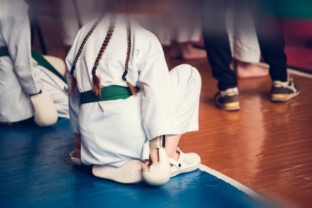A teenager girl with a yellow belt in karate class is doing stretching. Beautiful morning light. Oriental martial arts. Children's training. No faces. With place for text.