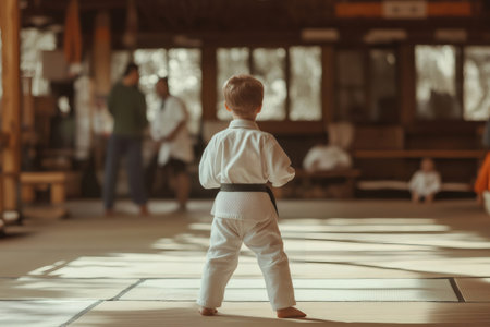 Rear view of a young child practicing martial arts, wearing a white uniform and black belt in a dojo