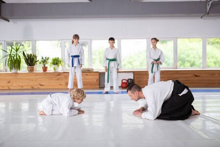 Showing aikido movements. Experienced teacher showing children aikido movements in spacious light center