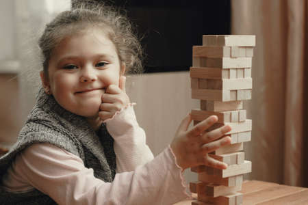 a little happy girl is playing the board game jenga at the table. Construction of a tower made of wooden cubes
