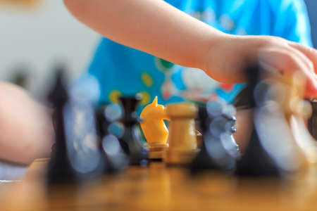 Cute preschool boy are playing chess at home. Funny face, selective focus.