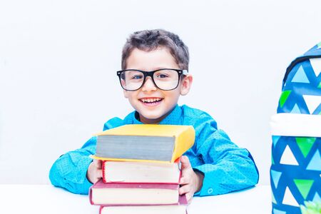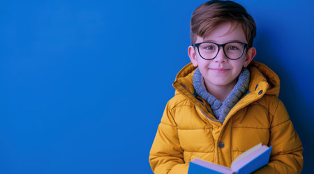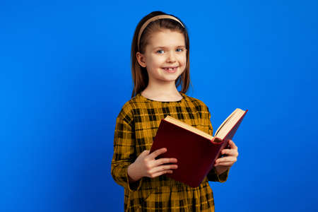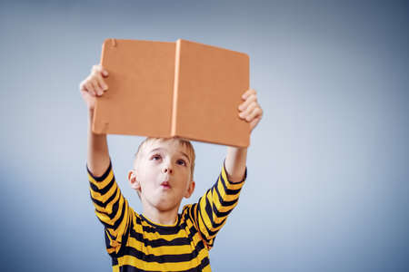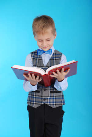 Portrait school boy with a book over blue background with copy space. Ten years old child with book, close-up. Education concept