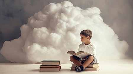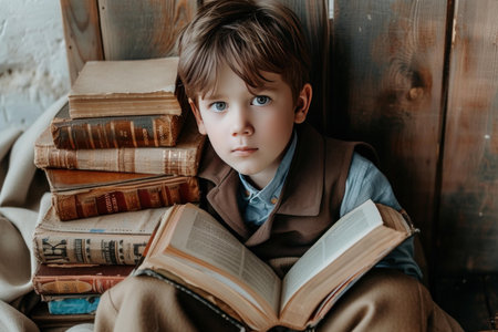 Thoughtful child engrossed in reading a book among a pile of vintage tomes