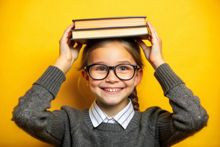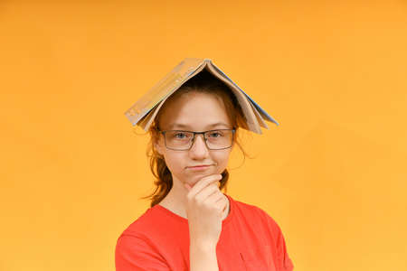 A pretty girl with glasses and books on her head. The child goes to school for the first time. A child on a yellow monochrome background. Back to school.