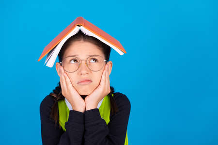 Photo of unhappy upset stressed negative mood girl look copyspace hold book head isolated on blue color background