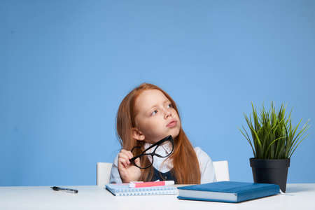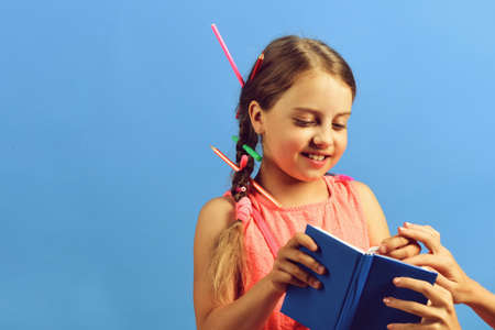 Schoolgirl adorable child. Childhood and upbringing. Knowledge and information. Small kid study. School life. Education concept. Basic knowledge. Back to school. Knowledge day. Serious about studying