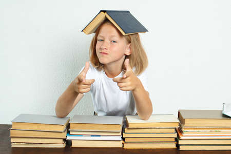 Education concept. The student sits at the table, points her fingers forward. She has a textbook on her head. Books are spread out nearby